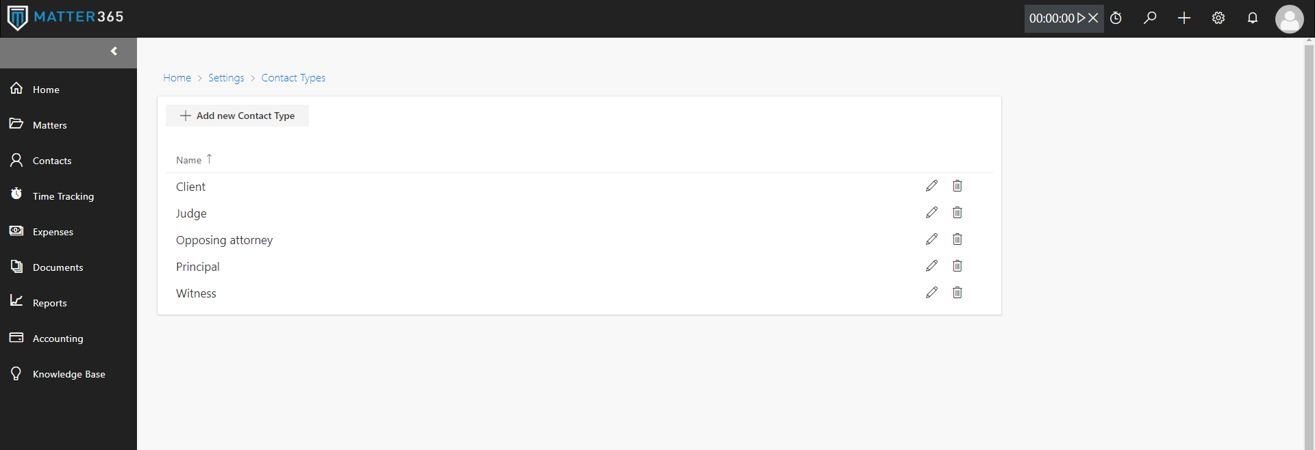 Matter365 application settingsOn this page, you can add new Contact types (Add new Contact Type button), edit (pencil button) or delete (trashcan button) existing ones.