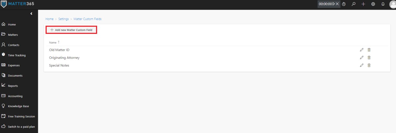 To create Custom fields that can be used for all your Matters, go toHome > Settings > Matter Custom Fields and click "Add new Matter Custom Field" button.