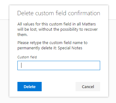 Please note, if you delete a Custom field you will lose all information that was inputted in the Custom field for all Matters. There is no option to recover that information.