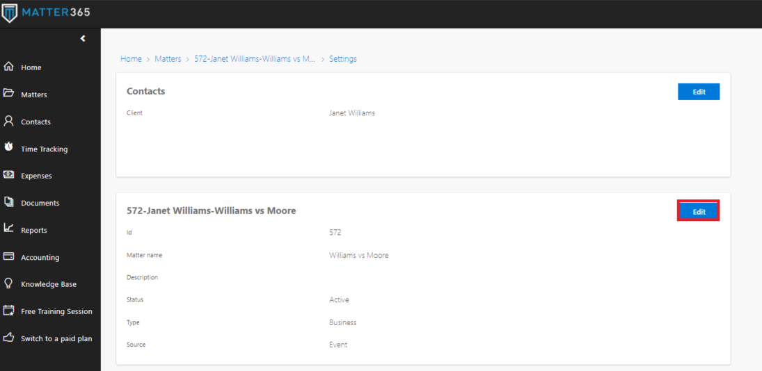 To edit information in Custom fields for a Matter go toMatter > Settings and click Edit on the Matter tile: