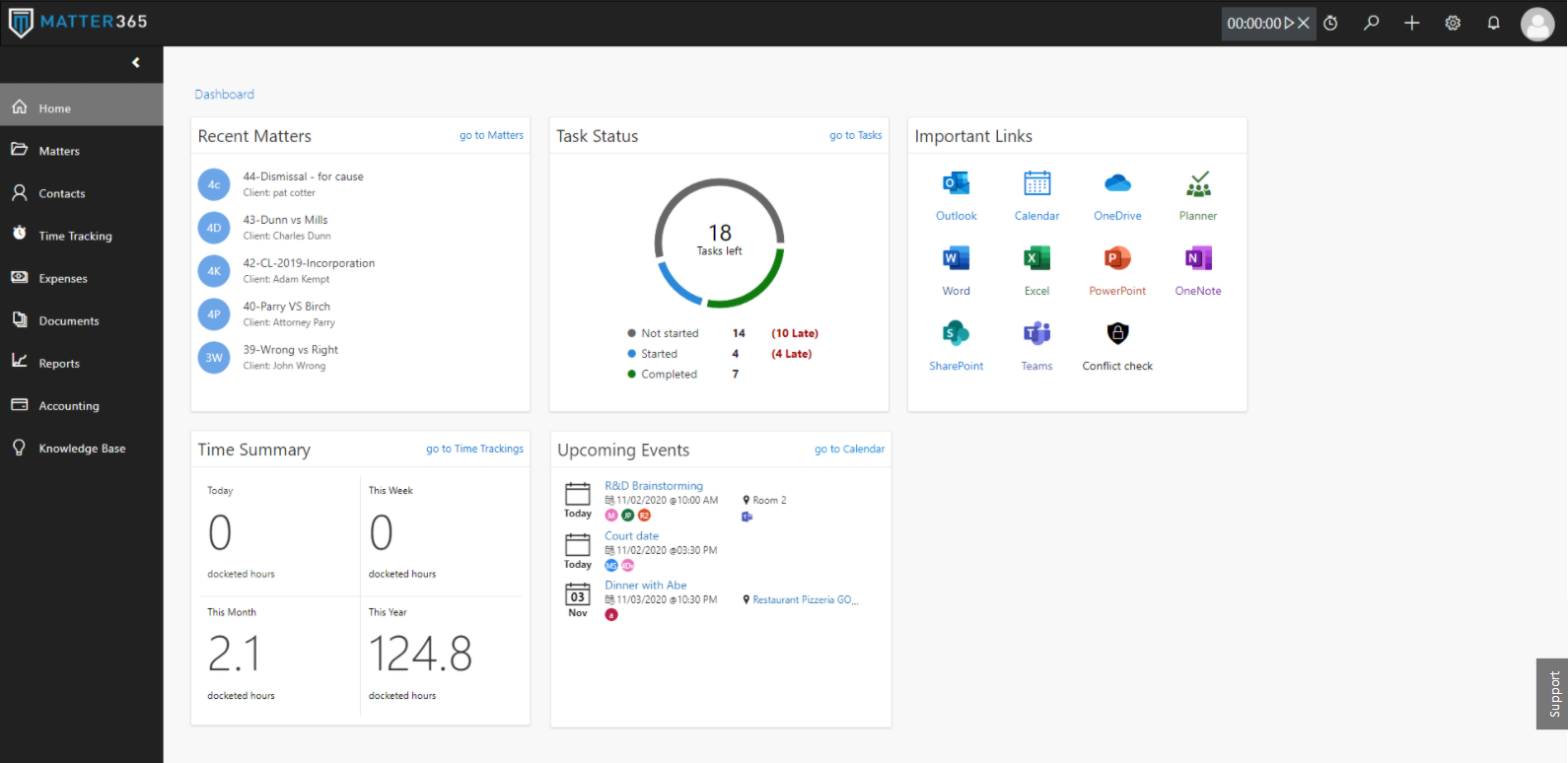 Matter365 logo in top left corner is a shortcut that will bring you back to Dashboard, regardless of the page of the application you are currently at.