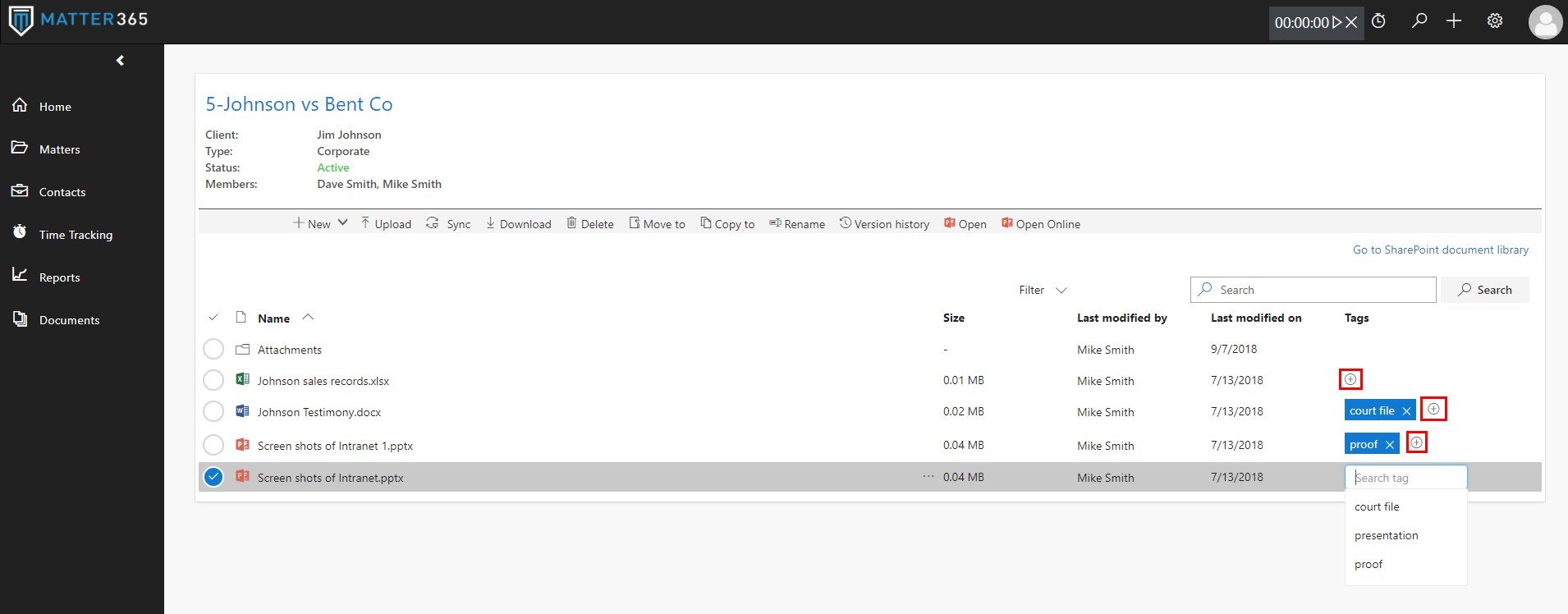 On both Matter documents pages (accessed from Matter dashboard, or accessed from Documents menu item on Matter365 left hand side main menu) it is possible to tag documents with custom created tags.