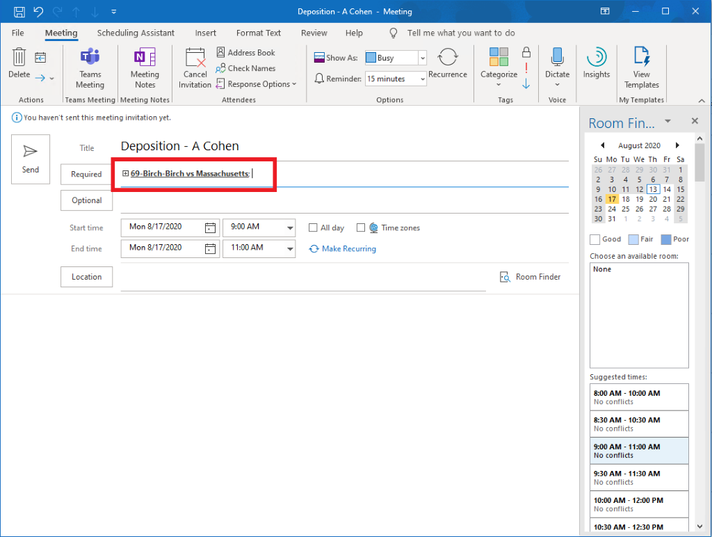 When you want to add an event to a Matter’s Calendar, you create the Event in your Outlook Calendar as you would for any other event, and simply invite the Matter to the event by adding the Matter’s email to the list of attendees and clicking “Send”.