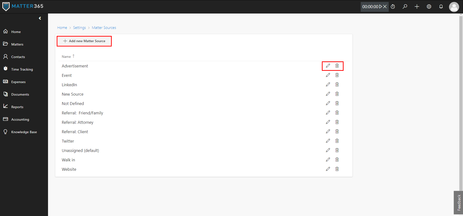 Matter sources pagePlease note that you won’t be able to delete a Matter source that is being used on any of the existing Matters.